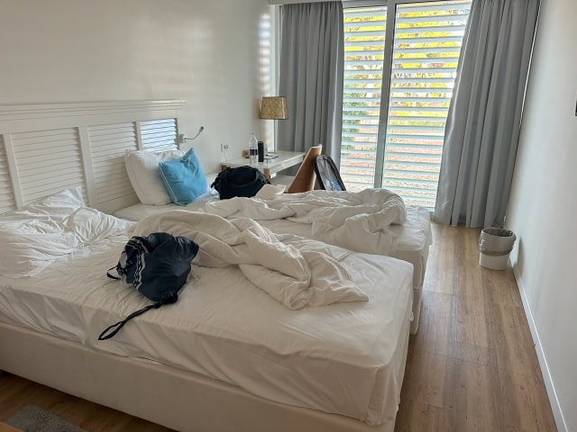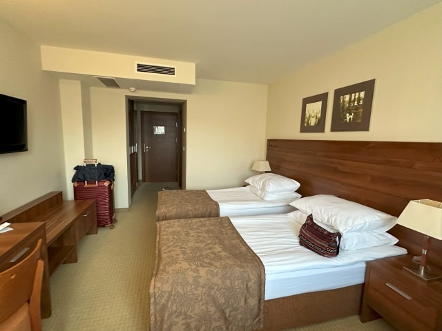 飯店房間陽光充足,就是隔音差。我們的講話聲,隔壁都聽得到。