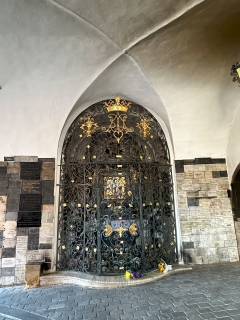 這壁龕裏頭供奉著一尊聖母畫像,據說在一次大火中,唯獨這聖母像絲毫未受損,因此信徒們才建照一座壁龕,並打造一道精美細緻的鐵門保護起來,此乃克羅埃西亞巴洛克式緞工的精心傑作。